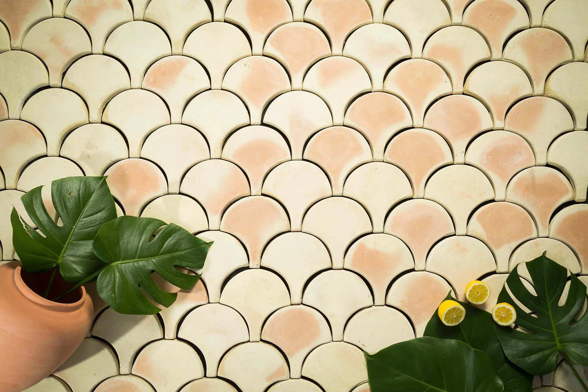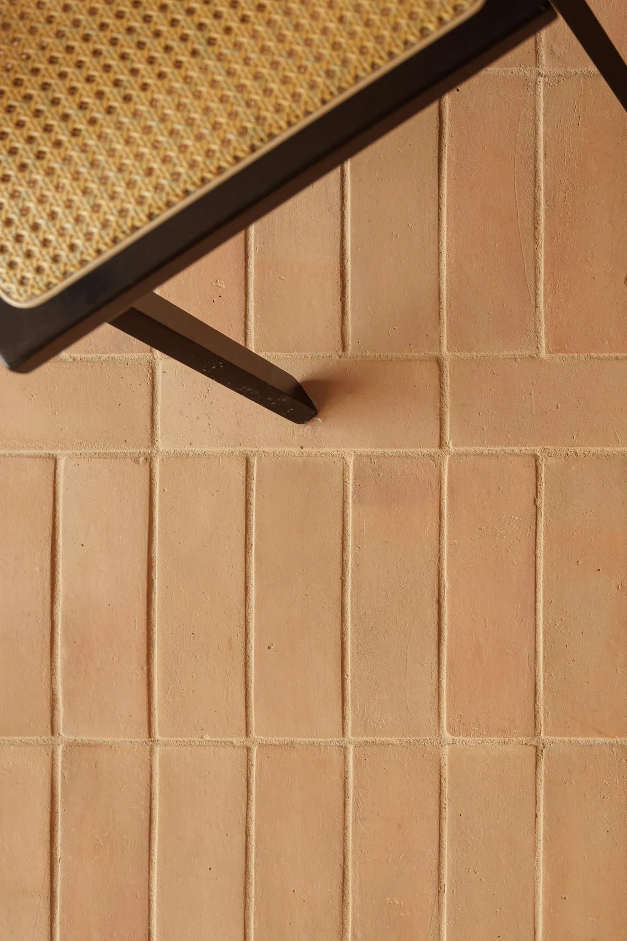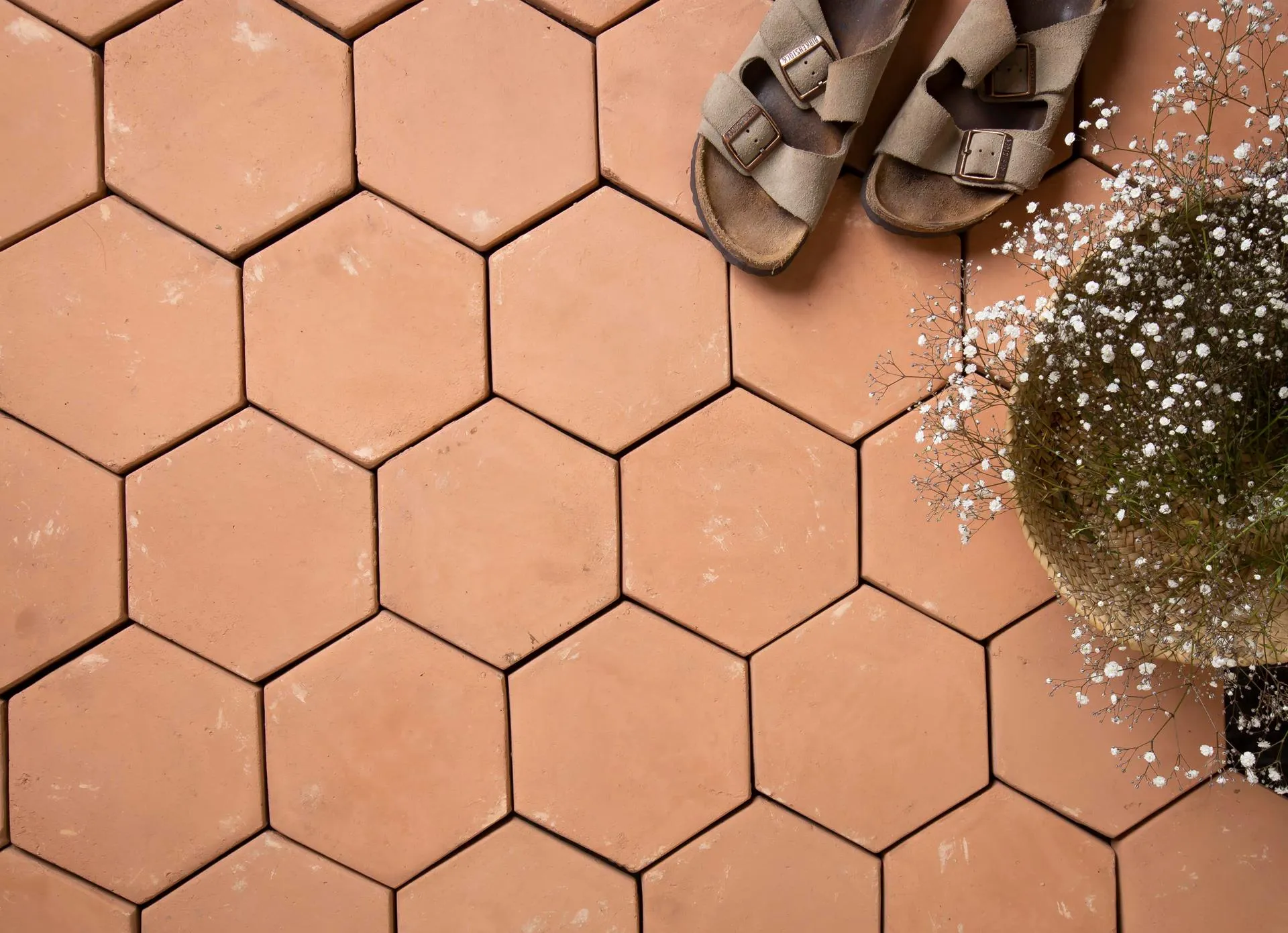 Pavimentos cálidos, naturales, de lujo rústico. Cada baldosa de barro cocido es artesanal, evocando los diseños geométricos de la tradición.