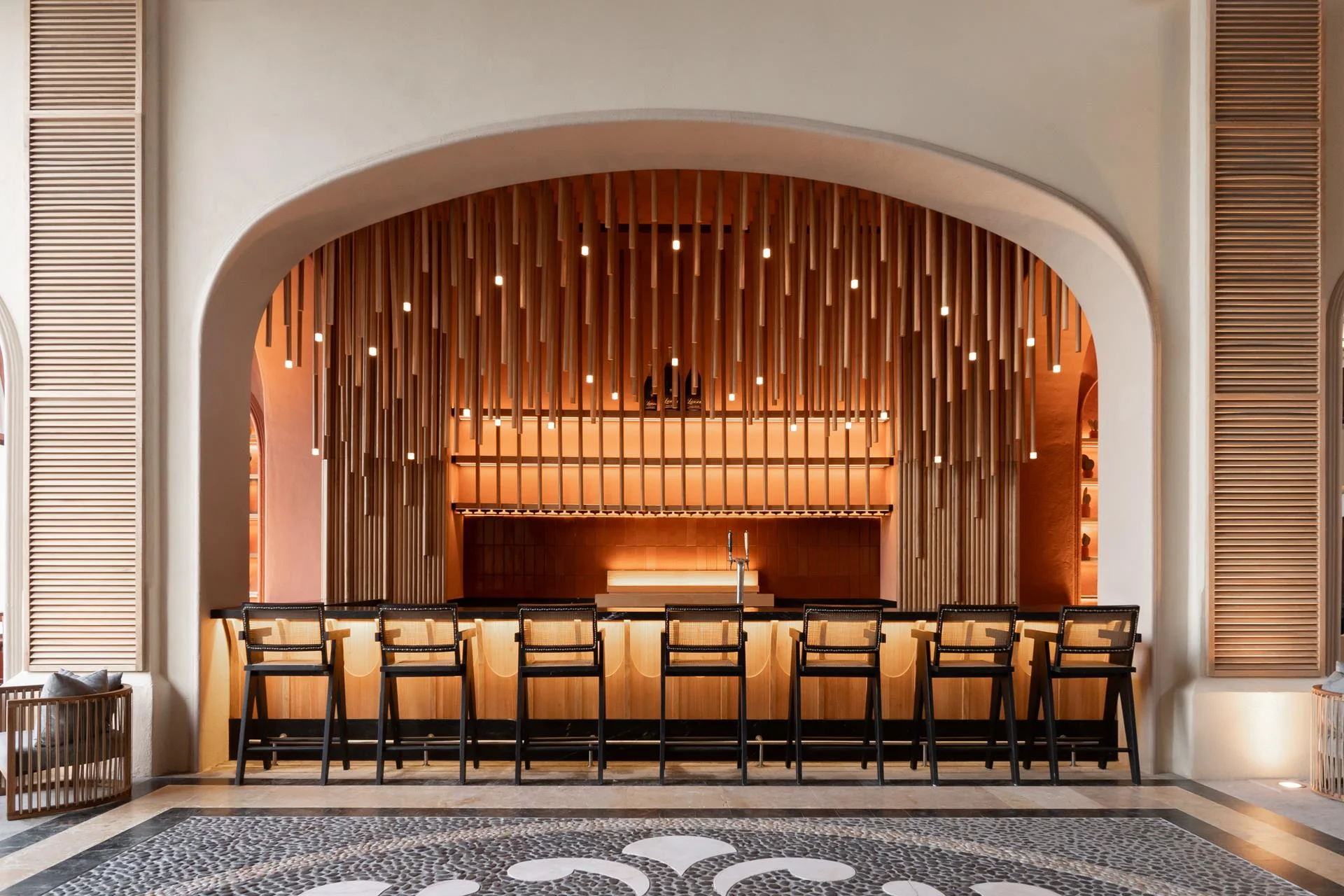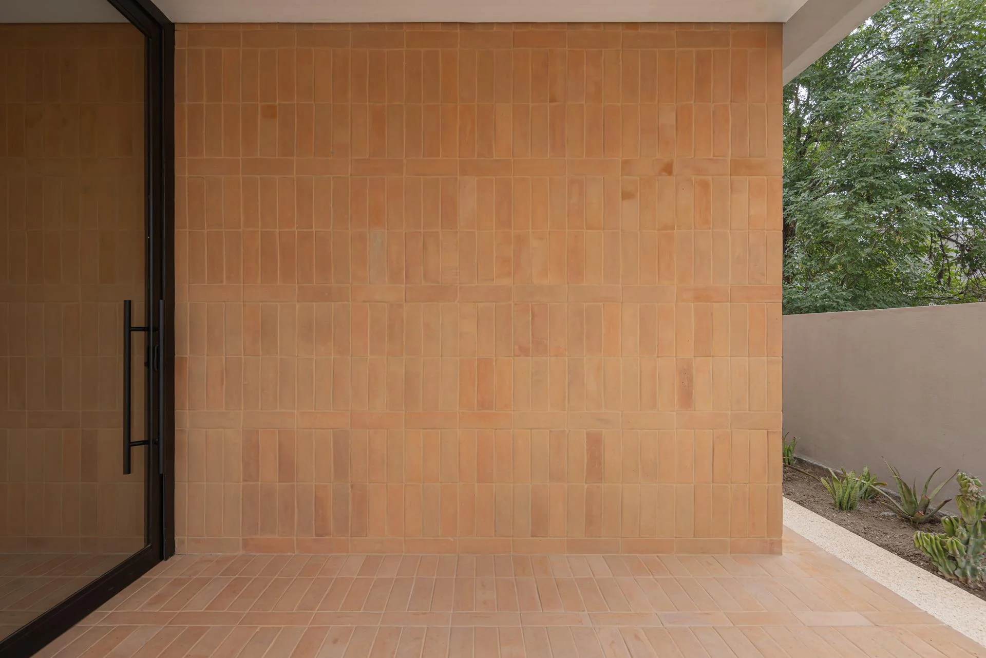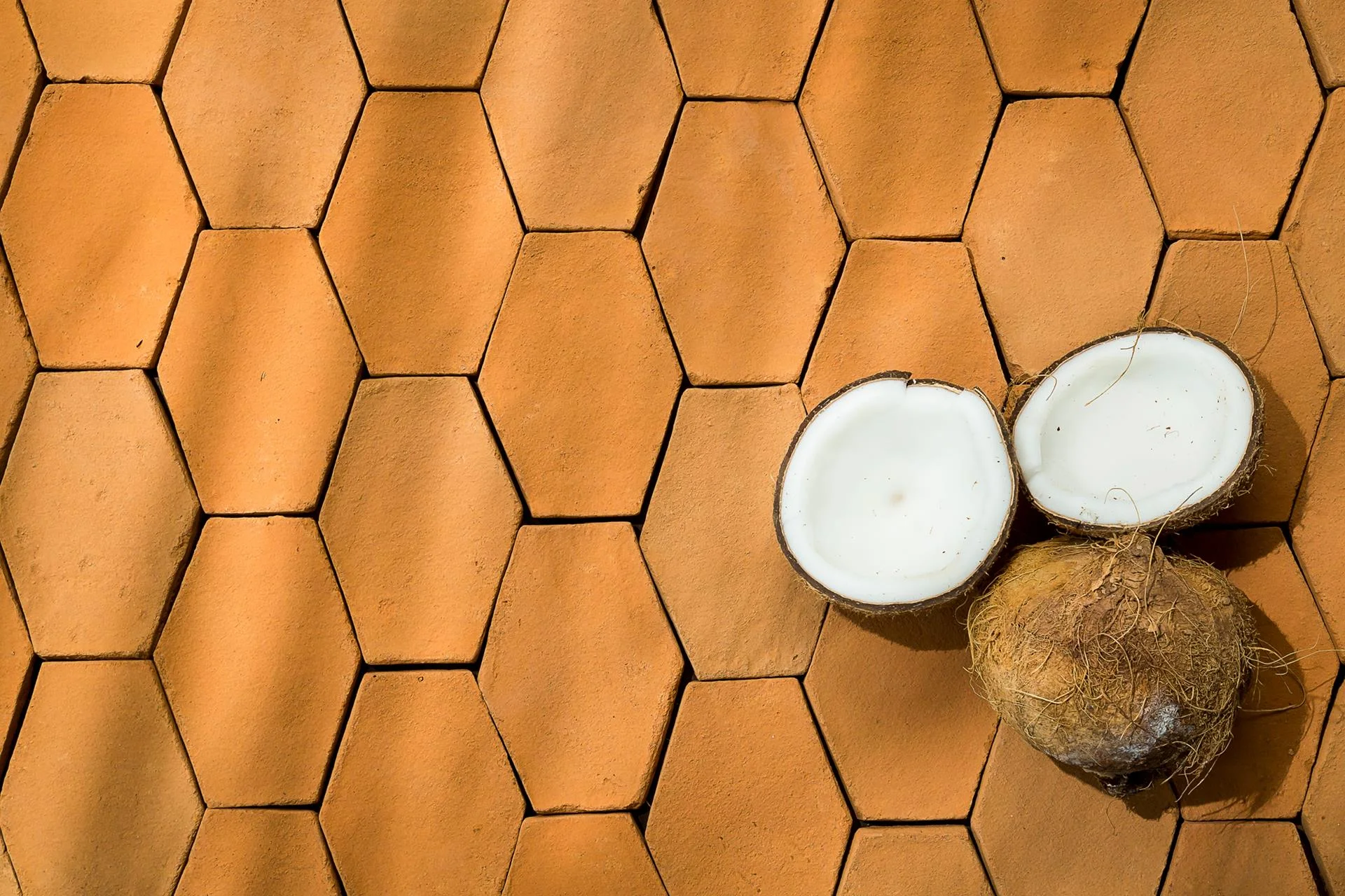 Pavimentos cálidos, naturales, de lujo rústico. Cada baldosa de barro cocido es artesanal, evocando los diseños geométricos de la tradición.